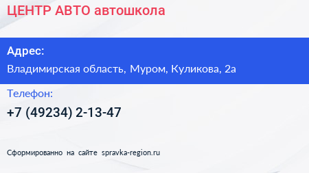 ЦЕНТР-АВТО, автошкола по адресу Владимирская область, Муром, Куликова, 2а в дальнейшем Организация, размещена в следующих категориях: