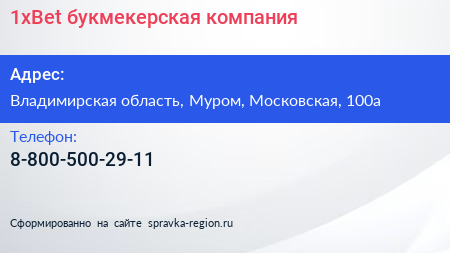 1хBet, букмекерская компания по адресу Владимирская область, Муром, Московская, 100а в дальнейшем Организация, размещена в следующих категориях: