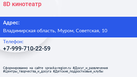 8D кинотеатр по адресу Владимирская область, Муром, Советская, 10 в дальнейшем Организация, размещена в следующих категориях: