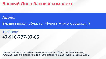 Банный Двор, банный комплекс по адресу Владимирская область, Муром, Нижегородская, 9 в дальнейшем Организация, размещена в следующих категориях: