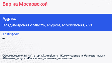 Бар на Московской по адресу Владимирская область, Муром, Московская, 69а в дальнейшем Организация, размещена в следующих категориях: