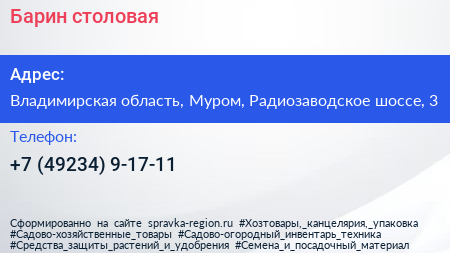 Барин, столовая по адресу Владимирская область, Муром, Радиозаводское шоссе, 3 в дальнейшем Организация, размещена в следующих категориях:
