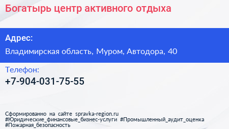 Богатырь, центр активного отдыха по адресу Владимирская область, Муром, Автодора, 40 в дальнейшем Организация, размещена в следующих категориях: