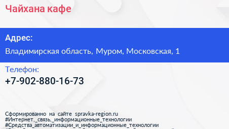 Чайхана, кафе по адресу Владимирская область, Муром, Московская, 1 в дальнейшем Организация, размещена в следующих категориях:
