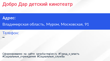 Добро-Дар, детский кинотеатр по адресу Владимирская область, Муром, Московская, 91 в дальнейшем Организация, размещена в следующих категориях: