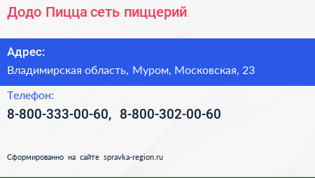 Додо Пицца, сеть пиццерий по адресу Владимирская область, Муром, Московская, 23 в дальнейшем Организация, размещена в следующих категориях: