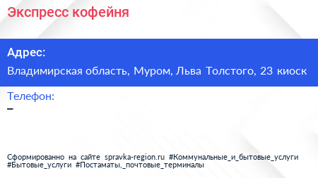 Экспресс-кофейня по адресу Владимирская область, Муром, Льва Толстого, 23 киоск в дальнейшем Организация, размещена в следующих категориях: