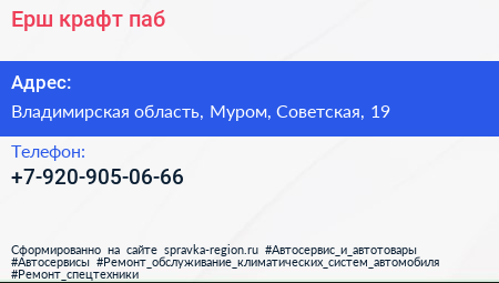 Ерш, крафт-паб по адресу Владимирская область, Муром, Советская, 19 в дальнейшем Организация, размещена в следующих категориях: