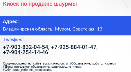 Киоск по продаже шаурмы по адресу Владимирская область, Муром, Советская, 13 в дальнейшем Организация, размещена в следующих категориях: