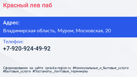 Красный лев, паб по адресу Владимирская область, Муром, Московская, 20 в дальнейшем Организация, размещена в следующих категориях: