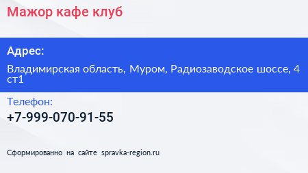 Мажор, кафе-клуб по адресу Владимирская область, Муром, Радиозаводское шоссе, 4 ст1 в дальнейшем Организация, размещена в следующих категориях: