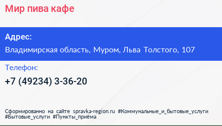 Мир пива, кафе по адресу Владимирская область, Муром, Льва Толстого, 107 в дальнейшем Организация, размещена в следующих категориях: