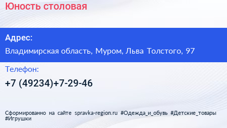 Юность, столовая по адресу Владимирская область, Муром, Льва Толстого, 97 в дальнейшем Организация, размещена в следующих категориях: