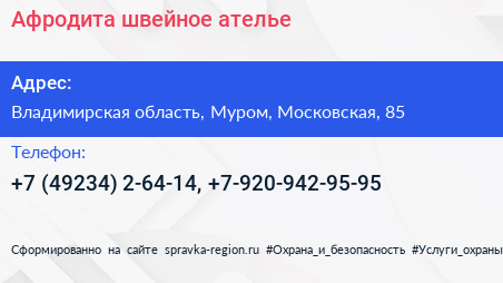 Афродита, швейное ателье по адресу Владимирская область, Муром, Московская, 85 в дальнейшем Организация, размещена в следующих категориях: