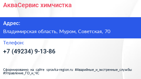 АкваСервис, химчистка по адресу Владимирская область, Муром, Советская, 70 в дальнейшем Организация, размещена в следующих категориях: