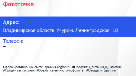 Фототочка по адресу Владимирская область, Муром, Ленинградская, 18 в дальнейшем Организация, размещена в следующих категориях: