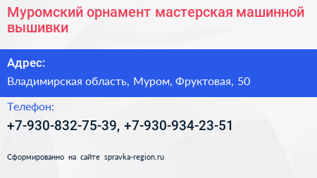 Муромский орнамент, мастерская машинной вышивки по адресу Владимирская область, Муром, Фруктовая, 50 в дальнейшем Организация, размещена в следующих категориях: