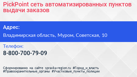 PickPoint, сеть автоматизированных пунктов выдачи заказов по адресу Владимирская область, Муром, Советская, 10 в дальнейшем Организация, размещена в следующих категориях: