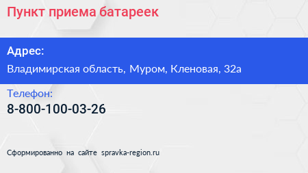 Пункт приема батареек по адресу Владимирская область, Муром, Кленовая, 32а в дальнейшем Организация, размещена в следующих категориях: