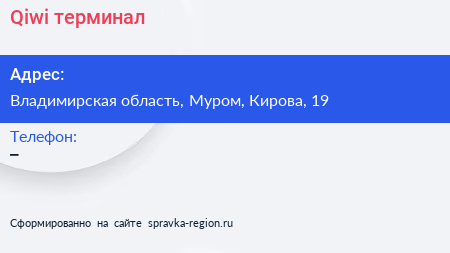 Qiwi, терминал по адресу Владимирская область, Муром, Кирова, 19 в дальнейшем Организация, размещена в следующих категориях: