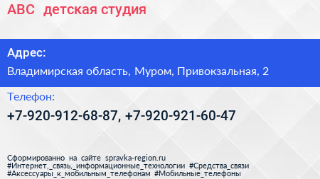 АВС+, детская студия по адресу Владимирская область, Муром, Привокзальная, 2 в дальнейшем Организация, размещена в следующих категориях: