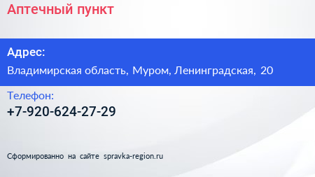 Аптечный пункт по адресу Владимирская область, Муром, Ленинградская, 20 в дальнейшем Организация, размещена в следующих категориях: