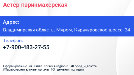 Астер, парикмахерская по адресу Владимирская область, Муром, Карачаровское шоссе, 34 в дальнейшем Организация, размещена в следующих категориях: