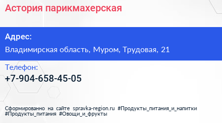 Астория, парикмахерская по адресу Владимирская область, Муром, Трудовая, 21 в дальнейшем Организация, размещена в следующих категориях: