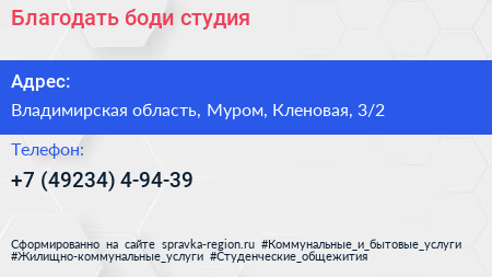 Благодать, боди-студия по адресу Владимирская область, Муром, Кленовая, 3/2 в дальнейшем Организация, размещена в следующих категориях:
