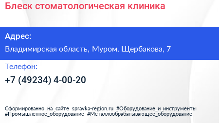 Блеск, стоматологическая клиника по адресу Владимирская область, Муром, Щербакова, 7 в дальнейшем Организация, размещена в следующих категориях: