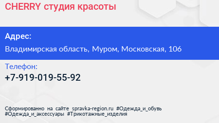 CHERRY, студия красоты по адресу Владимирская область, Муром, Московская, 106 в дальнейшем Организация, размещена в следующих категориях: