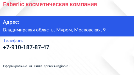 Faberlic, косметическая компания по адресу Владимирская область, Муром, Московская, 9 в дальнейшем Организация, размещена в следующих категориях: