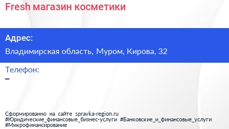Fresh, магазин косметики по адресу Владимирская область, Муром, Кирова, 32 в дальнейшем Организация, размещена в следующих категориях: