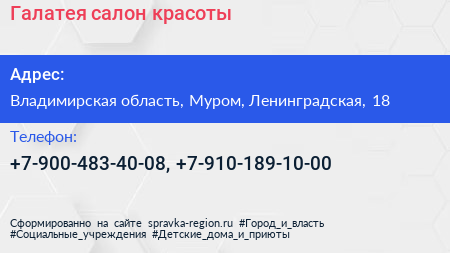 Галатея, салон красоты по адресу Владимирская область, Муром, Ленинградская, 18 в дальнейшем Организация, размещена в следующих категориях: