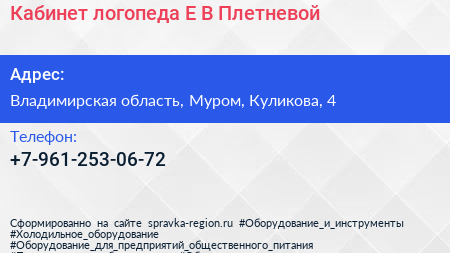 Кабинет логопеда Е.В. Плетневой по адресу Владимирская область, Муром, Куликова, 4 в дальнейшем Организация, размещена в следующих категориях: