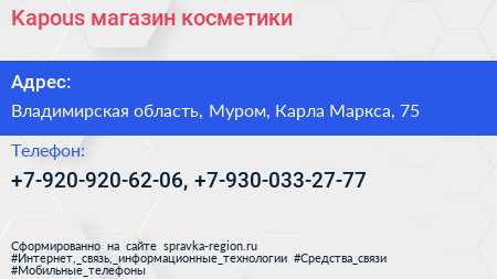 Kapous, магазин косметики по адресу Владимирская область, Муром, Карла Маркса, 75 в дальнейшем Организация, размещена в следующих категориях: