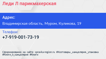 Леди Л, парикмахерская по адресу Владимирская область, Муром, Куликова, 19 в дальнейшем Организация, размещена в следующих категориях: