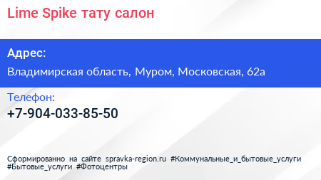 Lime Spike, тату-салон по адресу Владимирская область, Муром, Московская, 62а в дальнейшем Организация, размещена в следующих категориях: