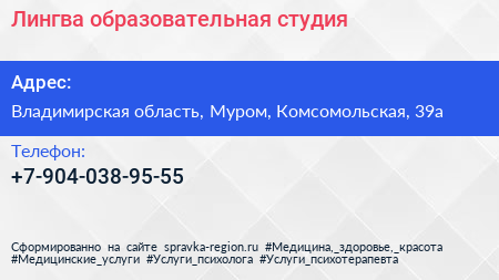 Лингва, образовательная студия по адресу Владимирская область, Муром, Комсомольская, 39а в дальнейшем Организация, размещена в следующих категориях: