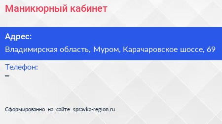 Маникюрный кабинет по адресу Владимирская область, Муром, Карачаровское шоссе, 69 в дальнейшем Организация, размещена в следующих категориях: