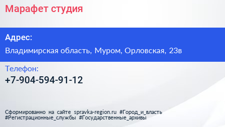 Марафет, студия по адресу Владимирская область, Муром, Орловская, 23в в дальнейшем Организация, размещена в следующих категориях: