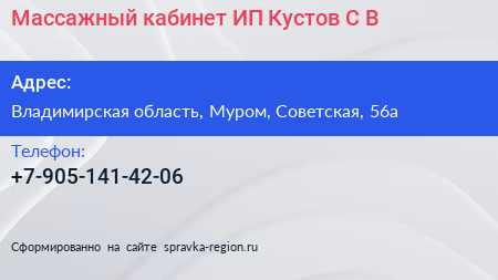 Массажный кабинет, ИП Кустов С.В. по адресу Владимирская область, Муром, Советская, 56а в дальнейшем Организация, размещена в следующих категориях: