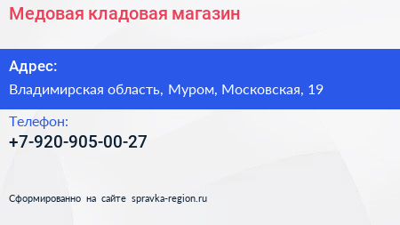 Медовая кладовая, магазин по адресу Владимирская область, Муром, Московская, 19 в дальнейшем Организация, размещена в следующих категориях: