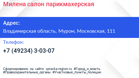 Милена, салон-парикмахерская по адресу Владимирская область, Муром, Московская, 111 в дальнейшем Организация, размещена в следующих категориях: