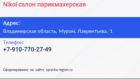 Nikol, салон-парикмахерская по адресу Владимирская область, Муром, Лаврентьева, 1 в дальнейшем Организация, размещена в следующих категориях: