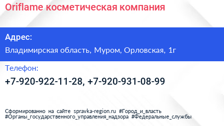Oriflame, косметическая компания по адресу Владимирская область, Муром, Орловская, 1г в дальнейшем Организация, размещена в следующих категориях: