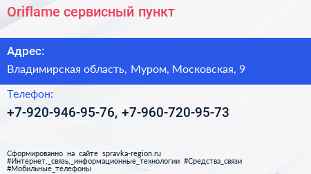 Oriflame, сервисный пункт по адресу Владимирская область, Муром, Московская, 9 в дальнейшем Организация, размещена в следующих категориях: