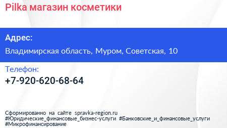 Pilka, магазин косметики по адресу Владимирская область, Муром, Советская, 10 в дальнейшем Организация, размещена в следующих категориях: