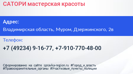 САТОРИ, мастерская красоты по адресу Владимирская область, Муром, Дзержинского, 2в в дальнейшем Организация, размещена в следующих категориях: