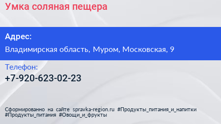 Умка, соляная пещера по адресу Владимирская область, Муром, Московская, 9 в дальнейшем Организация, размещена в следующих категориях:
